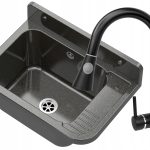 Zlew gospodarczy został wykonany z wytrzymałego polipropylenu, który cechuje się odpornością na działanie chemikaliów oraz wysoką wytrzymałością na czynniki zewnętrzne. Dodatkowo czarna marmurkowa powierzchnia nadaje mu eleganckiego wyglądu i łatwo wpisuje się w różnorodne style aranżacyjne. Bateria kuchenna z wyciąganą wylewką oferuje użytkownikowi wygodę obsługi dzięki obrotowej konstrukcji oraz możliwości wyboru dwóch funkcji strumienia wody.