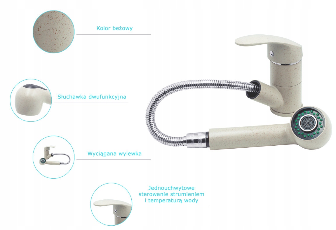 Bateria kuchenna w zestawie charakteryzuje się wysoką funkcjonalnością oraz estetycznym wyglądem. Dzięki obrotowej i wyciąganej wylewce korzystanie z niej staje się wyjątkowo wygodne. Ceramiczna głowica zapewnia trwałość i długą żywotność, a system anty-kamień dba o utrzymanie odpowiedniego poziomu higieny. Produkt spełnia najwyższe standardy jakości, co potwierdza Atest PZH.