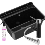 Zestaw zawiera także syfon z dodatkowymi wyjściami na pralkę lub zmywarkę, zestaw montażowy oraz wyciąganą baterię z dwoma trybami strumienia wody. Dodatkowo, w komplecie znajduje się spray do usuwania kamienia i osadów, co ułatwia utrzymanie produktu w czystości. Model LARGE to rozwiązanie idealne do garażu, pralni, warsztatu czy innych miejsc wymagających funkcjonalnego i wygodnego korzystania z wody.