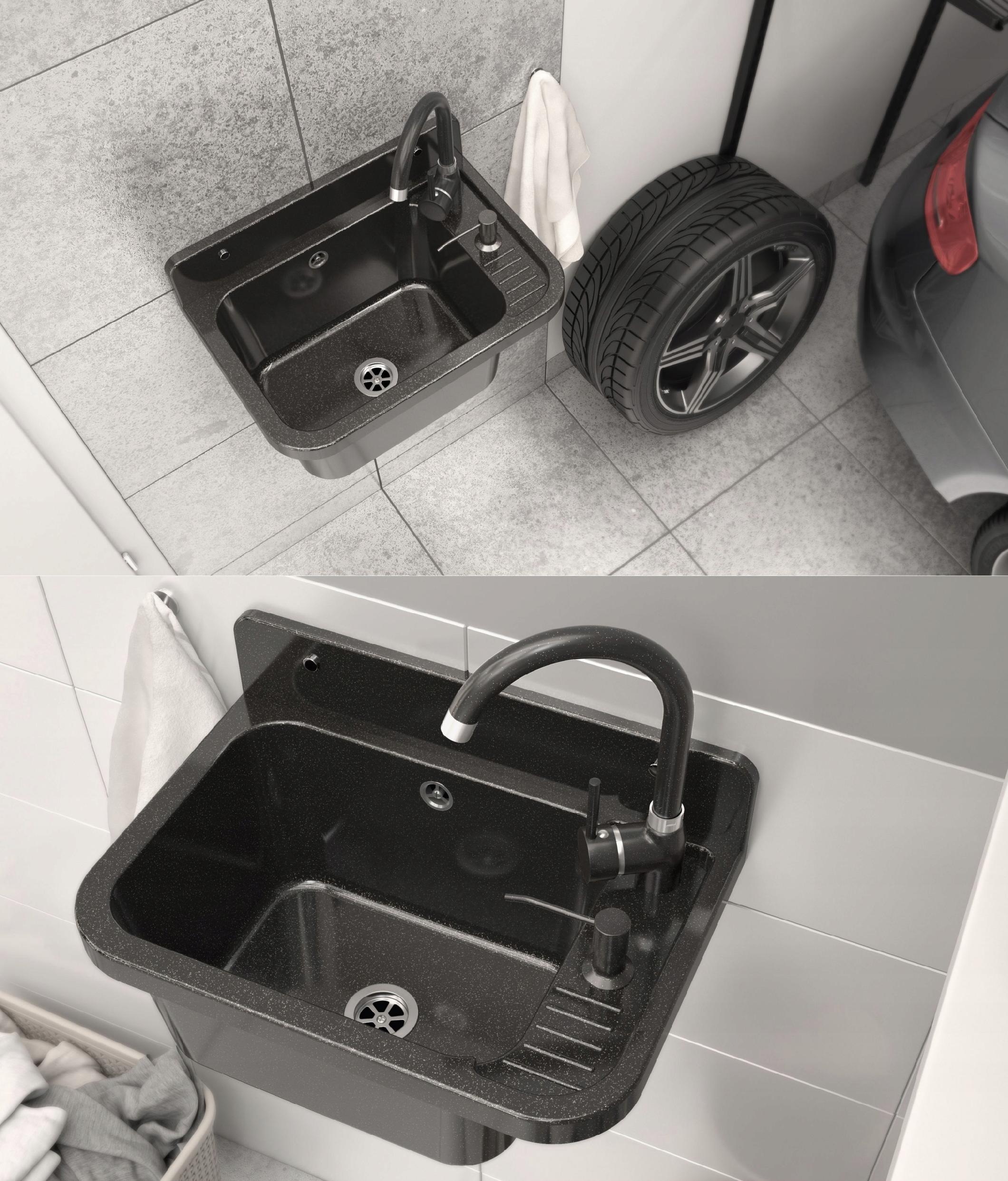 Zlew gospodarczy Paron czarny marmurkowy to praktyczne i solidne rozwiązanie dla osób szukających funkcjonalnego wyposażenia do garażu, pralni, kotłowni czy warsztatu. W skład zestawu wchodzi zlewozmywak gospodarczy, czarny dozownik ścienny oraz syfon z dodatkowym wyjściem na pralkę lub zmywarkę, co czyni ten produkt niezwykle wszechstronnym. Wykonany z wysokiej jakości materiałów takich jak polipropylen i tworzywo PVC, zestaw jest odporny na działanie środków chemicznych oraz wysokich temperatur. To doskonały wybór dla tych, którzy cenią trwałość i solidność.