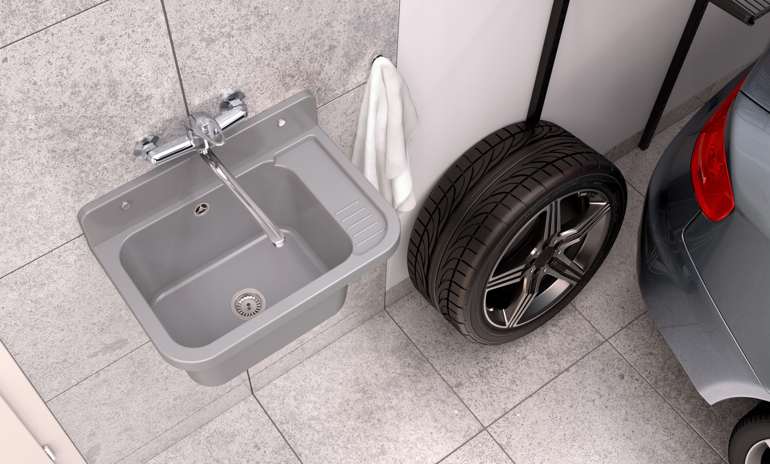• Garaż — praktyczny do porządkowania narzędzi i mycia rąk